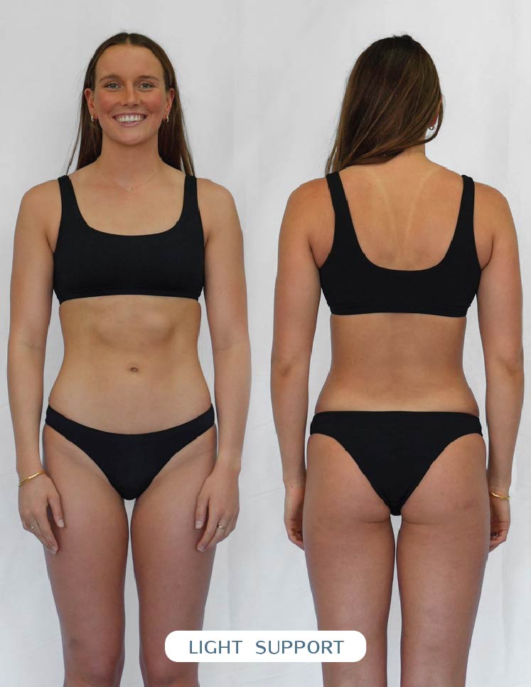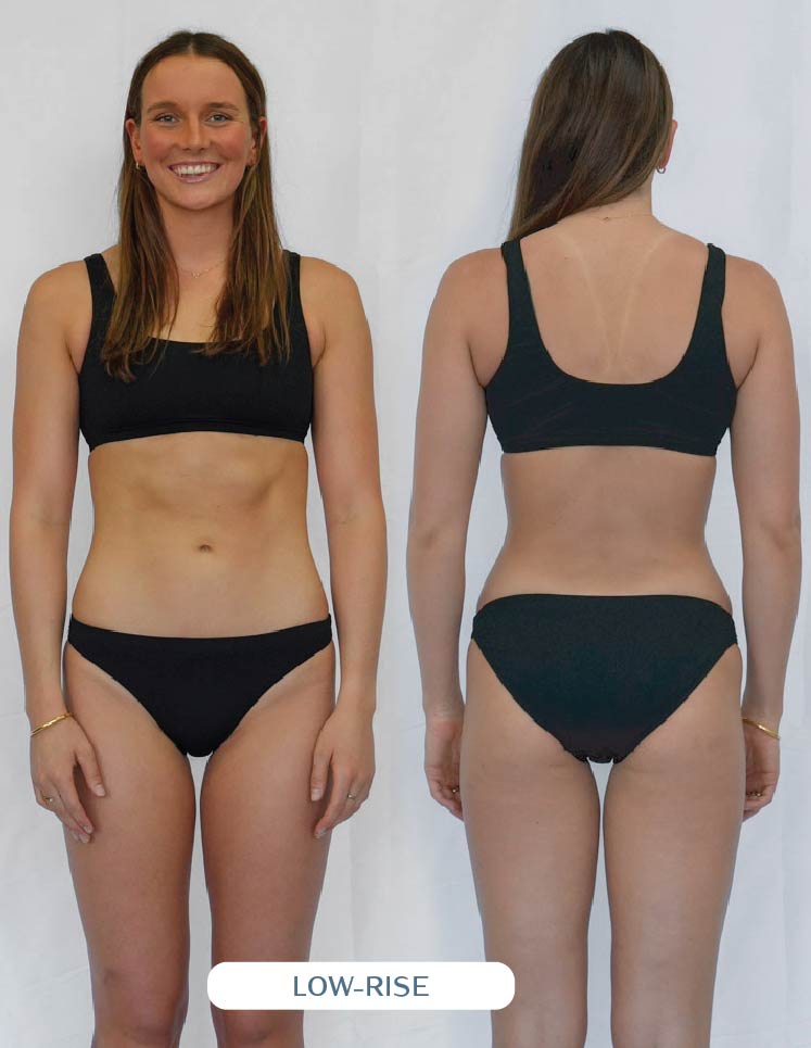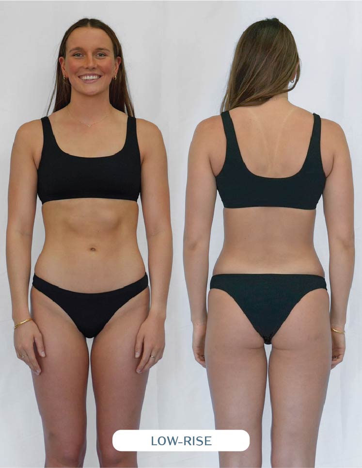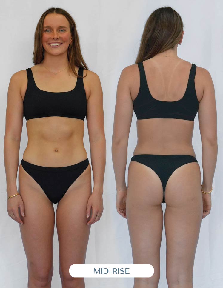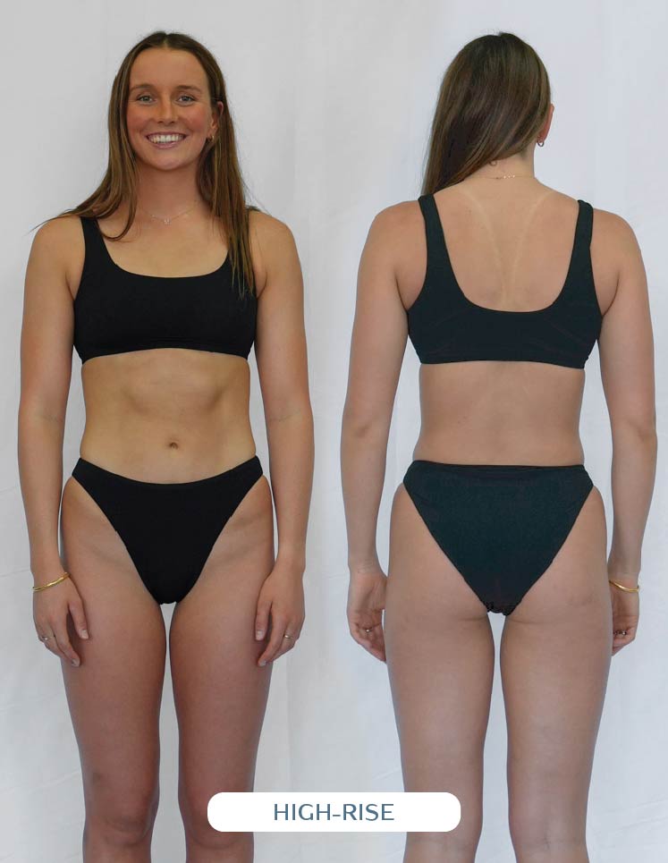 Our one piece designs are meant to sit higher on the hip (helps to enhance mobility and elongate those lovely legs). When you first put on your one piece, ensure it fits snugly around your pelvis and rests on or above your hip bone. If the suit doesn't sit high enough on your hips, the torso will feel too short, resulting in an overall improper fit.