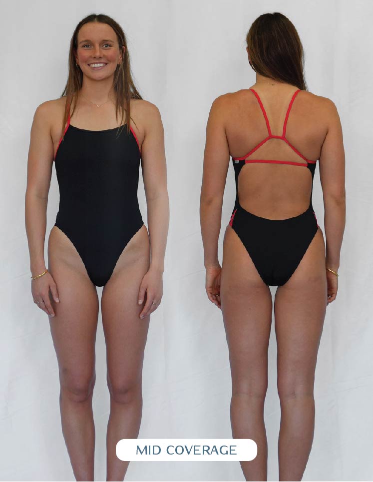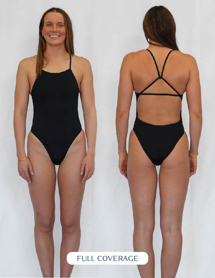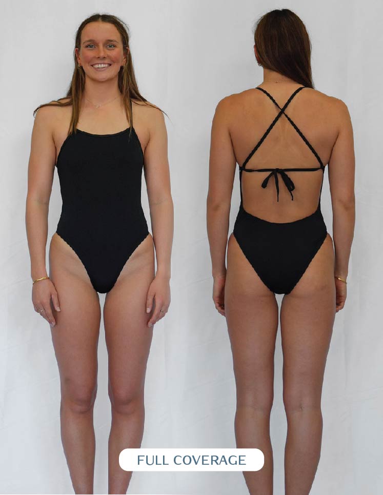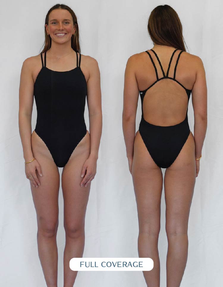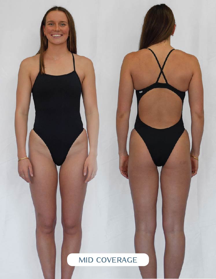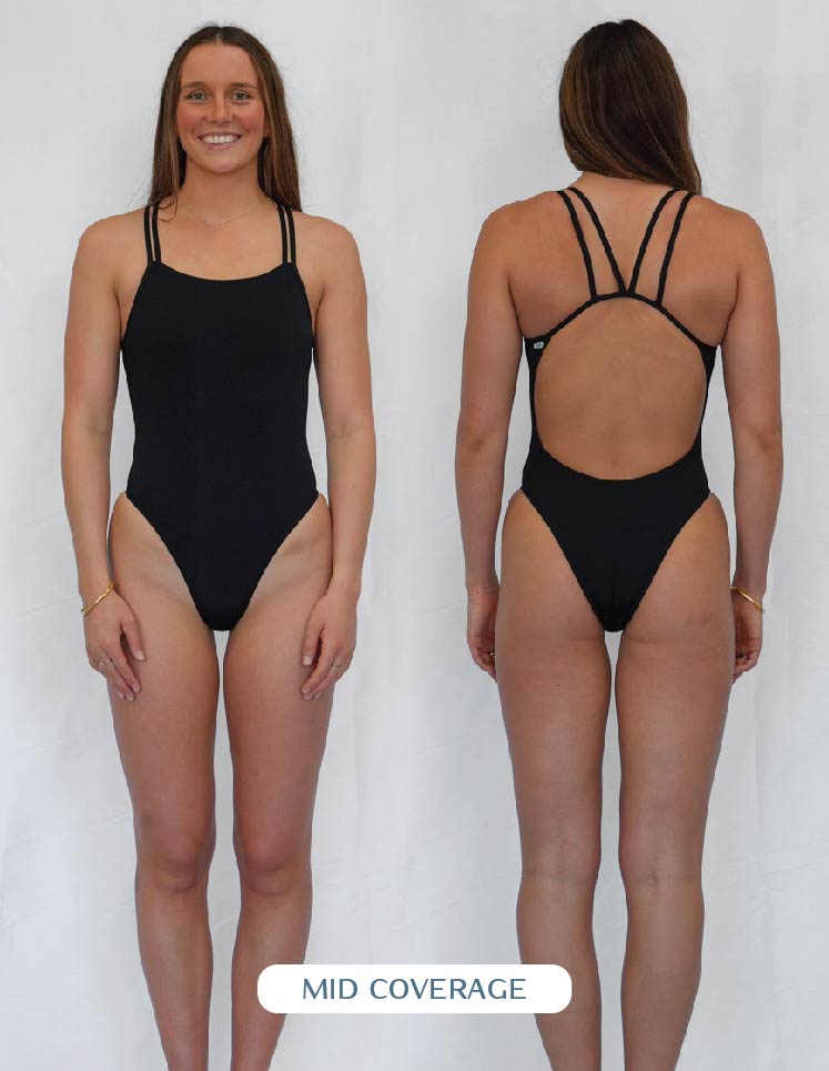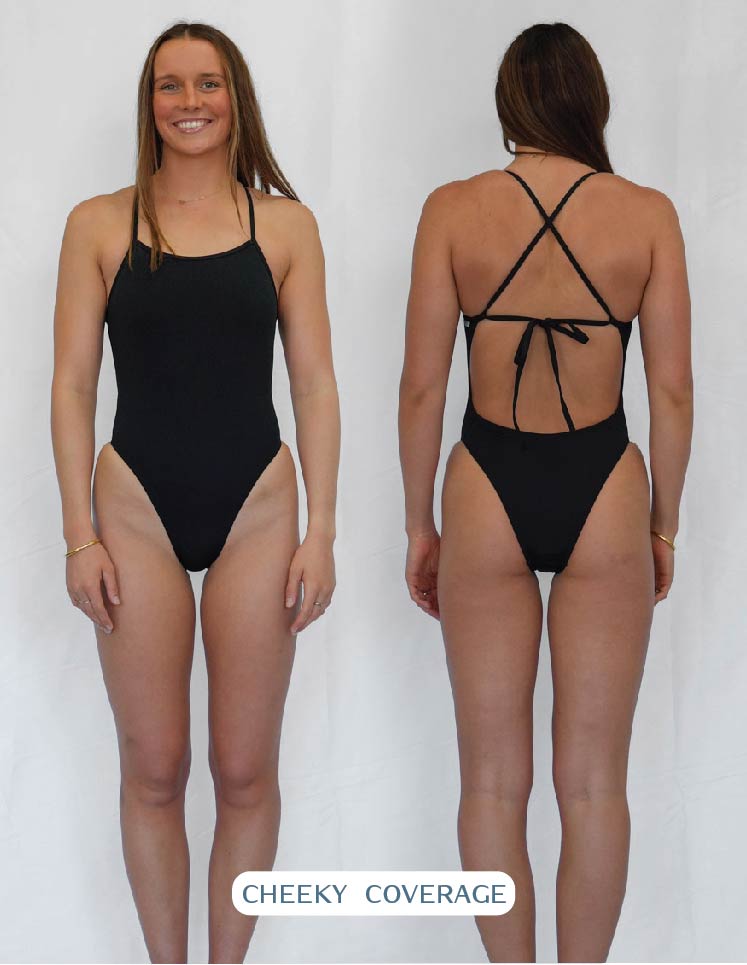 The coverage of your suit is determined by how it sits on your bum. Opting for fuller coverage means more material and a scoop look around your cheeks. Choosing mid-coverage means the cut will go across your cheek. It's entirely up to personal preference which style suits you; everyone prefers the material to sit differently on their buttocks. Some prefer the minimal look and pull the suit up, while others prefer to keep more covered and enjoy the fullness. Our fuller coverage one pieces are designed with more material around the backside, so if you don't have a fuller behind, medium coverage is a great option to showcase your beautiful bum without being too cheeky.